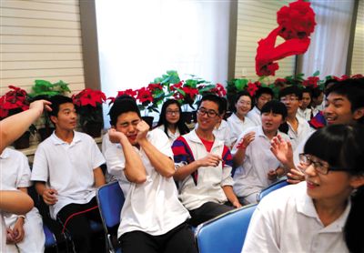 昨日,宏志中學的142名高考學生玩“擊鼓傳花”游戲。考前,該學校為學生開“大趴”解壓,希望學生們能輕松備考。新京報記者 薛珺 攝