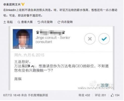 但是,作為挖角CEO的獵頭,其語言水平似乎并不怎么強。王興曝光的私信顯示,獵頭稱:“萬達集團XX,想邀請您作為萬達電商的職位,不知道您有沒有興趣接觸一下?”王興也在微博評論稱“那話好像不通順吧”。