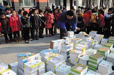 2015年1月23日,河南內黃一所小學院內,新華書店工作人員正分發新教材。現行規定只有新華書店等渠道可銷售教材。圖/CFP