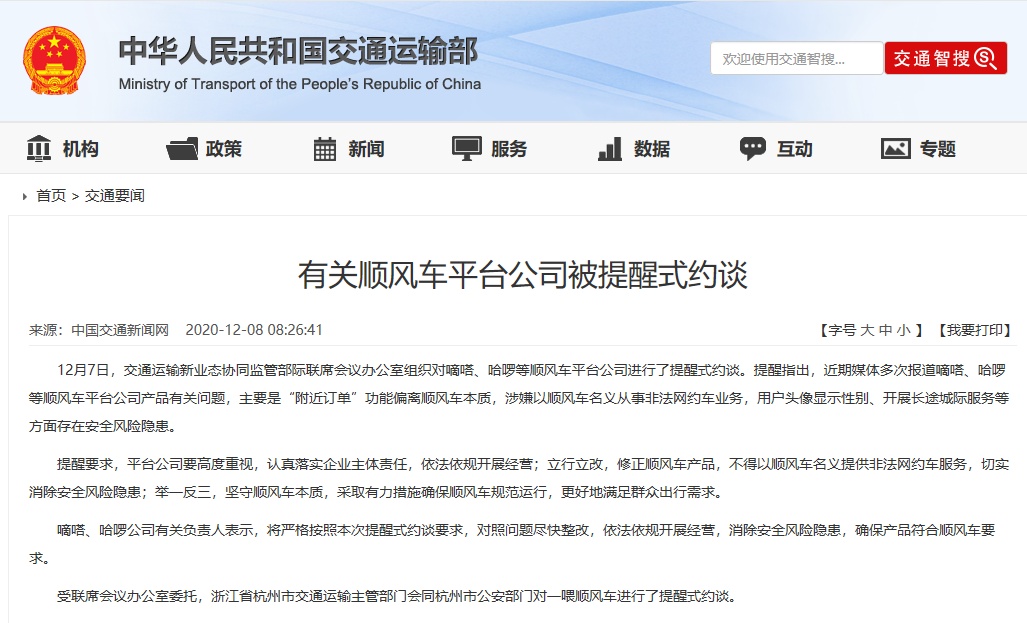 12月7日,交通運輸新業態協同監管部際聯席會議辦公室組織對嘀嗒、哈啰等順風車平臺公司進行了提醒式約談。提醒指出,近期媒體多次報道嘀嗒、哈啰等順風車平臺公司產品有關問題,主要是“附近訂單”功能偏離順風車本質,涉嫌以順風車名義從事非法網約車業務,用戶頭像顯示性別、開展長途城際服務等方面存在安全風險隱患。