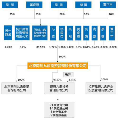 九鼎投資于2007年成立,是一家專業(yè)的私募股權(quán)投資(PE)管理機(jī)構(gòu)。創(chuàng)始人吳剛生于1977年,曾供職于中國證監(jiān)會(huì)監(jiān)管部檢查一處、風(fēng)險(xiǎn)辦一處,先后任副處長、處長;另一位創(chuàng)始人黃曉捷生于1978年,金融博士,曾是央行最年輕的處長。