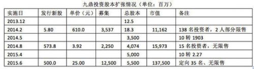 2015年5月,九鼎投資宣布以單價(jià)15-25元向不超過35家投資者發(fā)行5億新股,募集75到125億。由于認(rèn)購踴躍,發(fā)行價(jià)將取上限25元。
