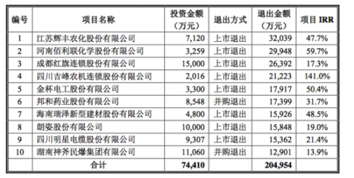 截至2013年10月31日,209個(gè)項(xiàng)目中已經(jīng)退出24個(gè),回收資金27億(對(duì)應(yīng)投資金額11.7億)。其中,回收資金排名前10的項(xiàng)目見下表: