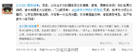 【北大清華四川招生組互指對(duì)方不正當(dāng)搶生源】上午,@北大四川招生組 稱(chēng),某校招生組給文理科前十選擇北大的考生挨個(gè)電話,稱(chēng)北大欺騙他們;@清華大學(xué)四川招生組 回應(yīng),"拿錢(qián)誘惑考生,不怕教壞小孩子嗎?"北大:"過(guò)去五年你們?cè)义X(qián)買(mǎi)走唐某、郭某,需要我講嗎?