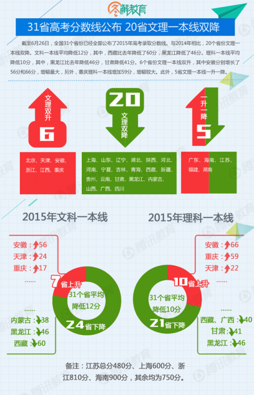 截至6月26日,全國(guó)31個(gè)省份已經(jīng)全部公布了2015年高考錄取分?jǐn)?shù)線。與2014年相比,20個(gè)省份文理一本線雙降。文科一本線平均降低12分,其中,西藏比去年降低了60分,黑龍江降低了46分。理科一本線平均降低10分,其中,黑龍江比去年降低46分,甘肅降低41分。6個(gè)省份文理一本線雙升,其中安徽分別增長(zhǎng)了56分和66分,增幅最大,另外,重慶理科一本線增加59分,增幅較大。此外,5省文理一本線一升一降。