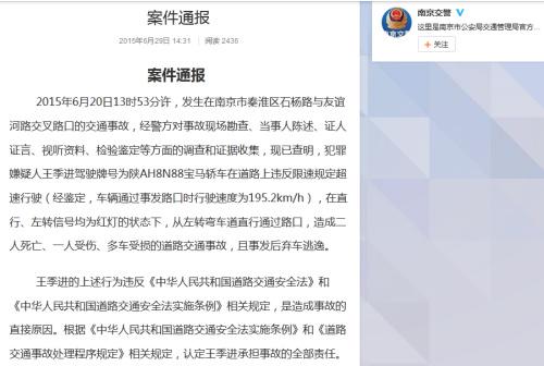 通報顯示,2015年6月20日13時53分許,發生在南京市秦淮區石楊路與友誼河路交叉路口的交通事故,經警方對事故現場勘查、當事人陳述、證人證言、視聽資料、檢驗鑒定等方面的調查和證據收集,現已查明,犯罪嫌疑人王季進駕駛牌號為陜AH8N88寶馬轎車在道路上違反限速規定超速行駛(經鑒定,車輛通過事發路口時行駛速度為195.2km/h),在直行、左轉信號均為紅燈的狀態下,從左轉彎車道直行通過路口,造成二人死亡、一人受傷、多車受損的道路交通事故,且事發后棄車逃逸。