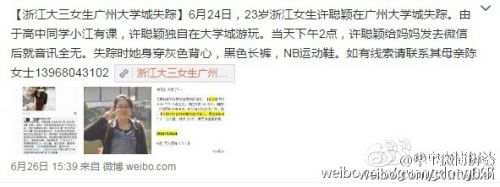 6月24日下午,浙江女大學生許聰穎在廣州大學城游玩時失蹤,失蹤時身穿灰色背心,黑色長褲,New Balance的運動鞋。