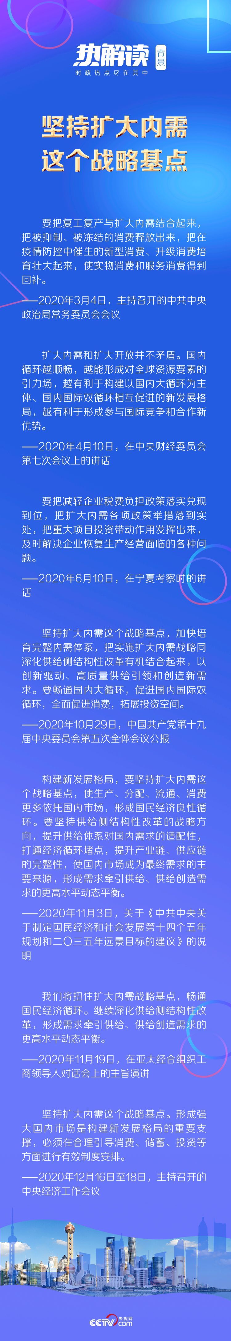 《熱解讀》梳理發現,“擴大內需”一詞在今年的高層會議中被反復提及,3月4日召開的中共中央政治局常務委員會會議指出“要把復工復產與擴大內需結合起來,把被抑制、被凍結的消費釋放出來”;9月8日,習近平總書記在全國抗擊新冠肺炎疫情表彰大會上強調“牢牢把握擴大內需這個戰略基點,保護和激發市場主體活力”;黨的十九屆五中全會提出“堅持擴大內需這個戰略基點,加快培育完整內需體系,把實施擴大內需戰略同深化供給側結構性改革有機結合起來,以創新驅動、高質量供給引領和創造新需求”……