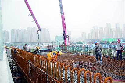 昨日上午,記者來到新疆路高架快速路工程普集路段,只見橋體已高高架起,如盤龍般聳立在杭州河上。在靠近普集路小區(qū)附近的一段橋體上,數(shù)十名施工人員正在橋面忙著進(jìn)行橋體混凝土澆筑。