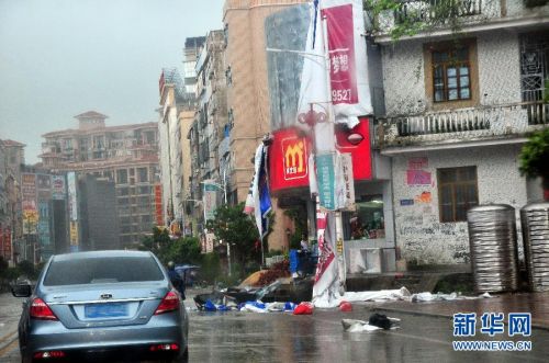 7月9日,臺風“蓮花”登陸地廣東省陸豐市陸城路旁廣告牌被臺風撕裂。當日12時15分,今年第10號臺風“蓮花”在廣東省陸豐市甲東鎮沿海地區登陸。記者從陸豐市三防辦了解到,在臺風“蓮花”正面襲擊下,截至9日17時,陸豐23個鎮(場、區)受災人口達71萬人,目前尚未接到因災出現人員傷亡情況的報告。新華社發(黃賢嘉 攝)