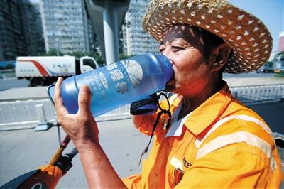 昨日下午2時(shí)許,北京廣渠門內(nèi)大街,一名東城環(huán)衛(wèi)工人在高溫下喝水解暑。 新京報(bào)記者 王貴彬 攝