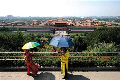昨日,景山山頂,有游客穿著厚重的“皇上”和“皇后”的服裝,撐起傘拍照。 新京報(bào)記者 薛珺 攝