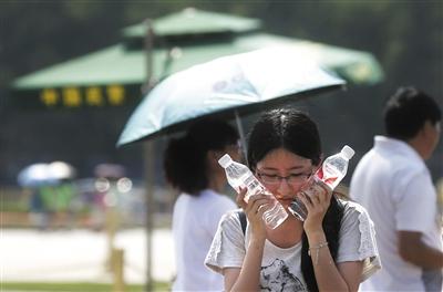 昨日下午,天安門廣場,一名女孩用兩瓶冰水敷臉降溫。 新京報(bào)記者 浦峰 攝