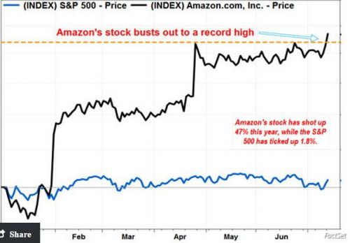 在今年截至目前為止的交易中,亞馬遜的股價(jià)則已經(jīng)大幅上漲了47%,是今年以來標(biāo)普500指數(shù)成分股中表現(xiàn)第四好的一只股票。而令這種表現(xiàn)變得更加令人印象深刻的則是,整體美國股市基本上陷入了一種靜止?fàn)顟B(tài),標(biāo)普500指數(shù)在今年迄今的交易中僅上漲了1.8%。