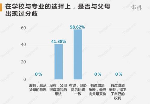 在學校與專業的選擇上, 58.62%的高考狀元承認與父母出現過分歧,但協商后達成一致,而沒有出現過分歧,父母很尊重孩子的想法的占比為41.38%。