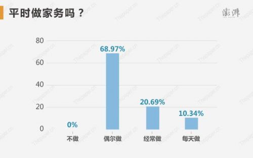 狀元們平時做家務嗎?68.97%的高考狀元選擇偶爾做,20.69%選擇經常做,10.34%選擇每天做,不做家務的狀元為零。