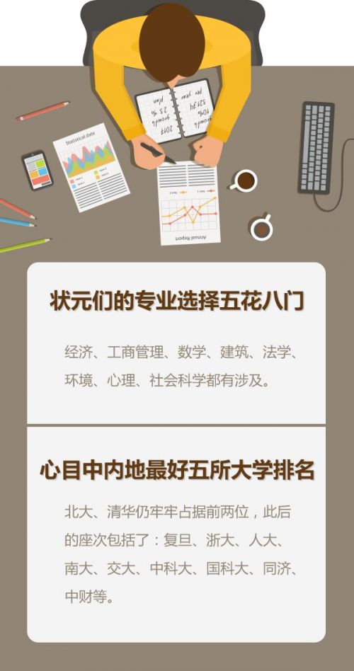 在狀元心目中內地最好五所大學排名中,北大、清華仍牢牢占據前兩位,此后的座次包括了:復旦、浙大、人大、南大、交大、中科大、國科大、同濟、中財等。