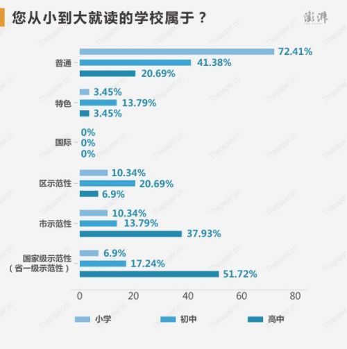 狀元們都是擇校狂人么?調查結果并非如此,小時候上的幼兒園屬于普通幼兒園的占比高達93.1%,普通小學比例 72.41%、普通初中比例41.38%,到了高中就有了大的變化,國家級示范性(省一級示范性)占比達到了51.72%。