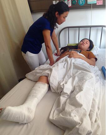 在陸軍總院骨科病房內(nèi),趙女士正在接受治療。在電梯墜落事故中她腰椎骨折,現(xiàn)在右半邊身子仍沒有知覺。
