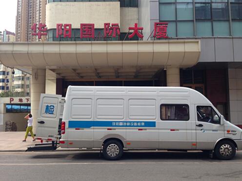 15日下午,特種設備檢測車停在華陽國際大廈門前