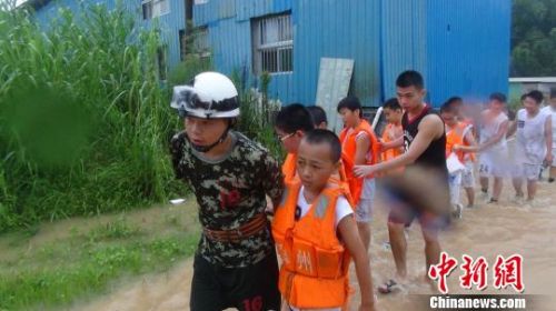 救援人員發(fā)現(xiàn),現(xiàn)場(chǎng)積水最深處達(dá)1.3米,且道路滿是泥土、石塊,消防車無法進(jìn)入,救援人員只得攜帶救援繩索、救生衣等工具涉水前往事故現(xiàn)場(chǎng),將被困30名小孩救出。