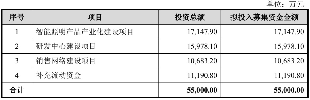 據招股說明書顯示,本次公開發行股票的數量為不超過1,683.4126 萬股,且本次公開發行股票數量不低于發行后總股本的25%。募集資金主要用于智能照明產品產業化建設項目、研發中心建設項目、銷售網絡建設項目和補充流動資金等。