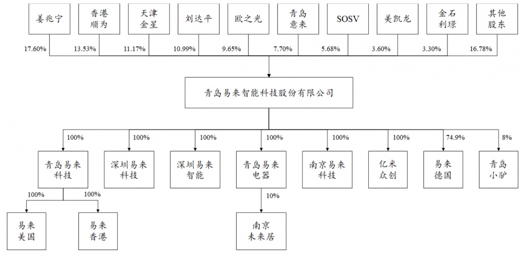 招股說明書顯示,易來智能控股股東和實際控制人為姜兆寧和劉達平,兩人的持股比例分別為17.60%和10.99%。公司共有21名股東,其中,持有公司11.17%股份的第三股東天津金星,是由小米科技全資持股的投資企業。