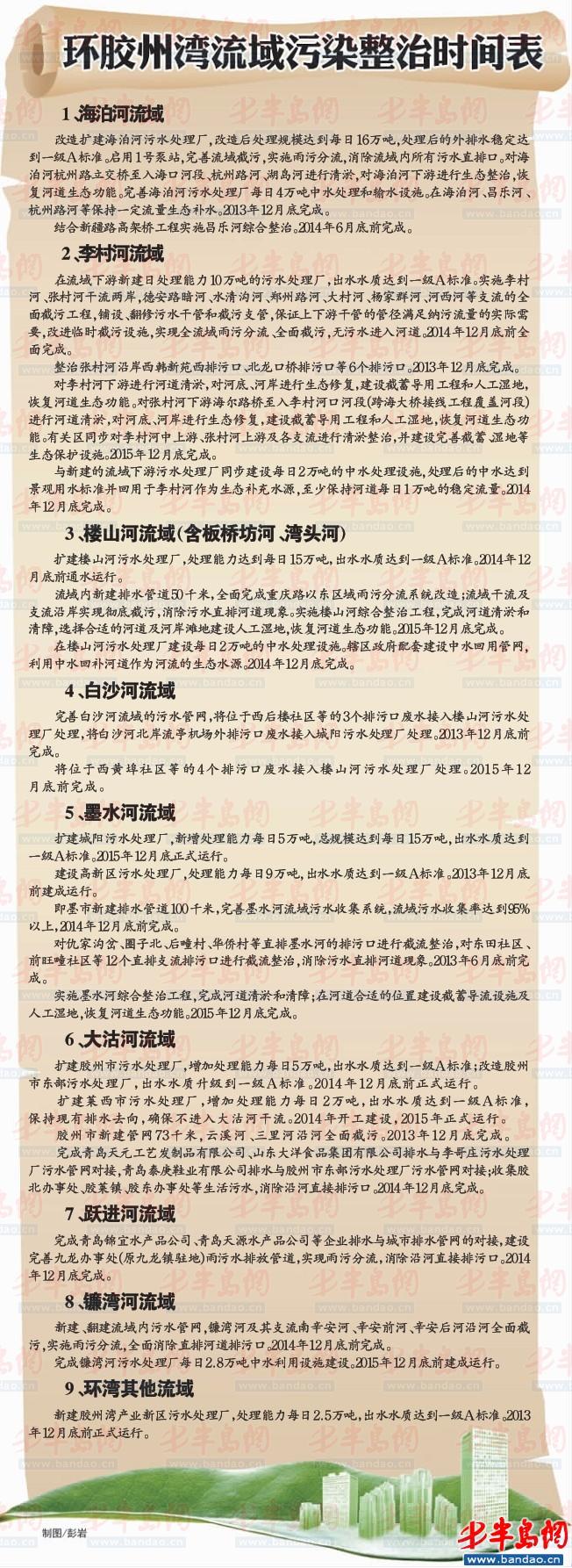 包括:督促雙桃精細化工、海晶化工、東風化工、自力化工、青啤麥芽廠等8家企業搬遷或轉型。2015年12月底前完成。督促青啤麥芽廠等15家直排入河(或入海)企業將廢水接入市政污水管網。2013年12月底前完成。督促太平洋恩利等9家企業對污水處理設施進行提標改造,達到半島流域水污染物排放標準中的一級標準。2013年6月底前完成。嚴查涉水工業項目違規建設、超標排污等違法行為,不斷提高監管績效,持續降低工業水污染物排放強度。2013年完成創新體系建設,2013~2015年全面執行。
