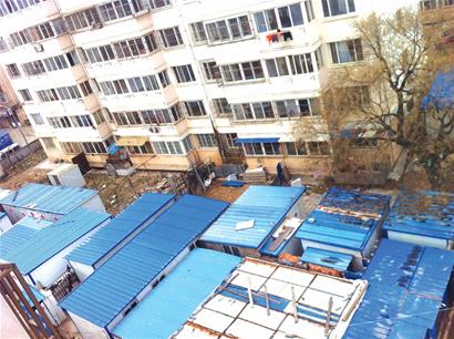 小區內,這樣簡易的搭建大多存在于居民樓一樓的窗下,一米見方的雜物堆兒,在每個單元門口幾乎都有一兩個。更多的是“排列整齊”的活動板房,把路邊綠化帶直接占滿,從小區東頭一字排到西頭。多數活動板房門前都用油漆噴涂著 “車庫門前請勿停車”的字樣,如果是不明真相的市民經過,可能會認為這是小區統一布局的車庫。