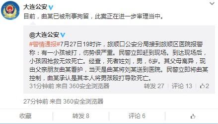 7月27日19時許,旅順口公安分局接到旅順區醫院報警稱:有一小孩被打,傷勢很嚴重。民警立即趕到現場。到達現場后,小孩因搶救無效死亡。經查,死者姓劉,男,6歲。其父母離異,現由父親朋友曲某看護,當天是曲某將劉某送到醫院。民警立即將曲某控制,曲某承認是其本人將男孩毆打導致死亡。