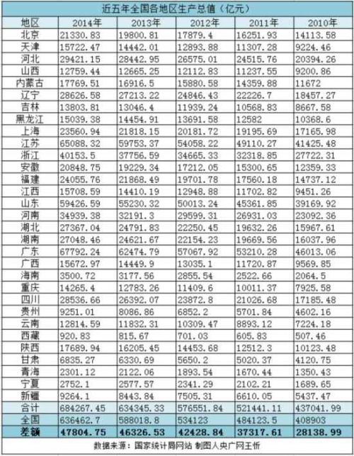 地方省市GDP之和再次超出全國已經不是什么新鮮事。從年度數據來看,此前幾年也一直存在這個問題。央廣網財經記者統計了近五年個省市的GDP數據發現,從2010年至2014年,官方發布的國內生產總值分別為408903、484123.5、534123、588018.8、636462.7億元,而31省市的GDP數據之和卻連年超出全國,2014年超出全國47804.75億元,而且差額越來越大,呈逐年遞增的態勢。