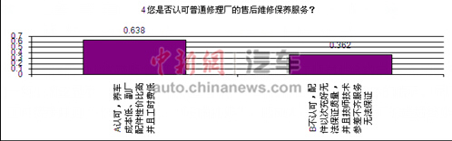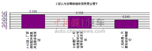 在“您認為去哪做維修保養更合理?”問題上,中新網汽車頻道調查顯示,36.4% 的人認為,4S店更合理,因為廠家授權配件保真并且服務有保證;45.5%的人認為修理廠更好,價格便宜可以節省養車成本支出;18.2%的人表示“無所謂,只要車修好哪都行”。與此不同的是,數字100市場研究公司調查顯示,39.8%的人選擇4S店;35.6%的人選擇修理廠,其他人表示“無所謂”。