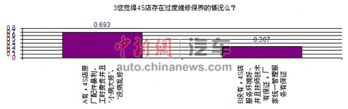 在“您覺得4S店存在過度維修保養的情況么?”問題上,超過90%的被調查者認為, 4S店原廠配件暴利、工時費貴并且“小病大修”、“沒病亂修”;其余的人認為,4S店服務環境好、并且技師技術有保證 ,廠家統一管理服務有保證。數字100市場研究公司調查顯示,69.3%的人認為,存在過度維修保養的情況,其余的人認為沒有這種情況。