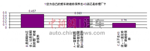 在為愛車做維修保養方面,是去4S店?還是去修理廠?中新網汽車頻道方面的調查顯示,20%的人群一直都按照用戶手冊定期到4S店做保養,70%的人群在質保期內去、但過質保期之后會到修理廠做維修保養;數字100市場研究公司調查顯示,38.3%的人按照用戶手冊到4S店做保養,45.7%的人群在質保期內去、但過質保期之后會到修理廠做維修保養。可見,保質期內選擇4S店、保質期之外選擇修理廠是多數人的選擇。