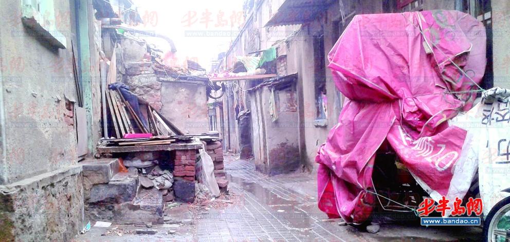 李大爺是青島港務局的退休員工,也是最先住進這里的居民,現在已七十多歲。“這里的房子在20多年前就說著要拆了,一直到現在也沒動靜。”李大爺說道,“冬天沒有供暖,并且這里的廁所也經常堵,早就不想住這了。”記者看到,坑坑洼洼的路上積著泥水,在李大爺17.9平方米的屋中,墻面是由磚塊壘成,再涂上白色涂料。而這白色的涂料不斷掉下形成大片脫落的淺坑。由于是雨天,屋中的地面濕漉漉的,墻根上有滲水的痕跡。李大爺兩口子對此早已習以為常。屋頂靠木頭支撐著,如果不是在外面看到這是兩層樓房,很難想象這樣的屋頂上面還支撐著一座房子。