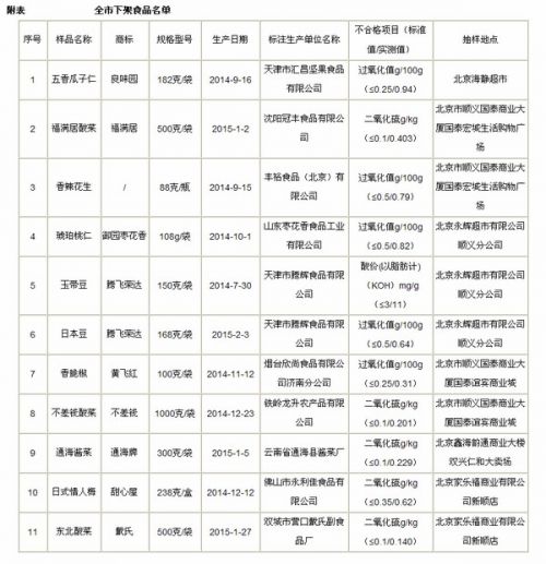 新華食品 5日,北京市食品藥品監(jiān)督管理局發(fā)布信息,“良味園”牌五香瓜子仁等11種食品因過氧化值、二氧化硫超標(biāo)等原因下架。不合格食品分別來自國泰、永輝、家樂福等大型商超。