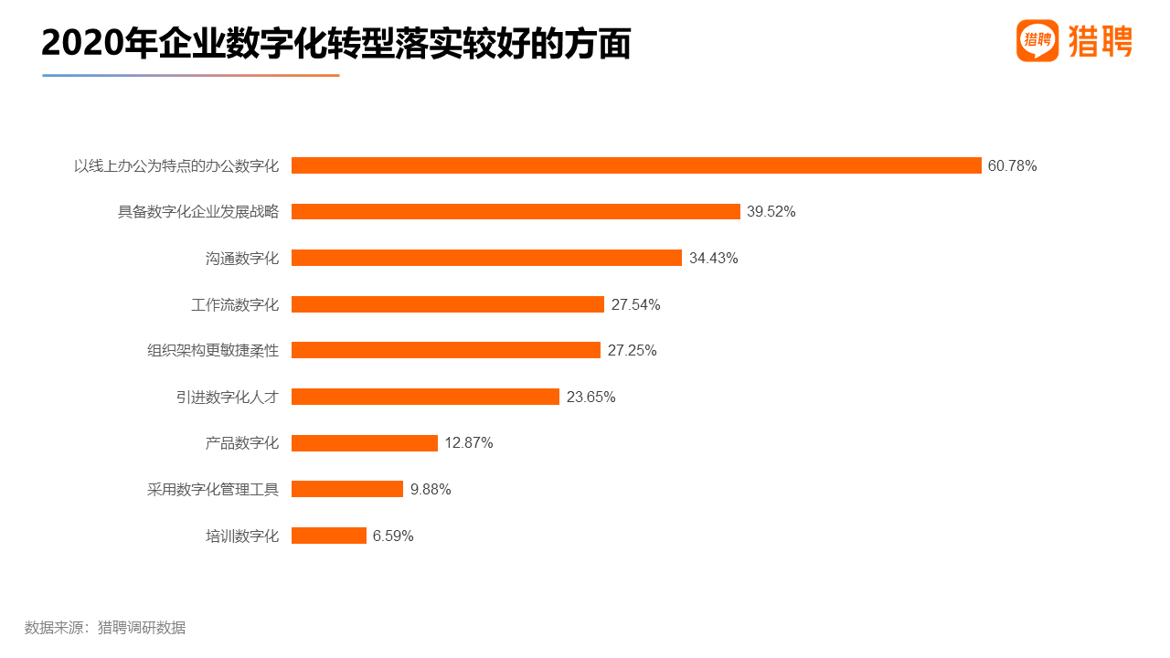 人力資源作為企業管理、運營的重要組成部分,成為企業數字化轉型的先發領域。從獵聘針對企業的調研來看,2020年,55.56%的企業增加了遠程辦公培訓,58.59%的企業增加了業務線上轉型培訓;采用遠程辦公方式的企業得票率高達89.37%。