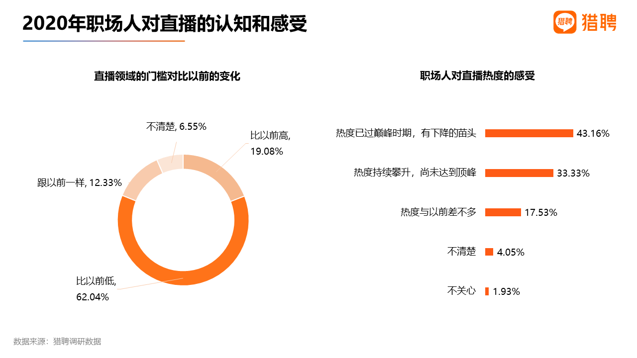 從獵聘此次調研來看,62.04%的職場人認為現在做直播的門檻比以前低。得益于技術發展,每個人都可以使用移動端設備隨時隨地開啟直播。當然,這不意味著每個人都能通過直播成名或獲利。直播的精細化發展趨勢對于直播參與者提出了更高要求,因而網紅背后大多都有著專業的運營團隊作為支撐。