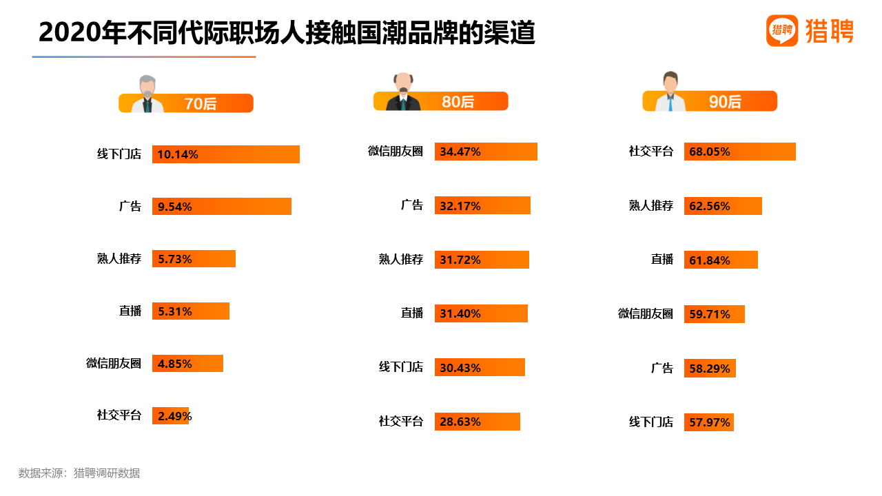 總體來看,職場人接觸國潮品牌的四大渠道是社交平臺、熟人推薦、直播和微信朋友圈,得票率分別為52.62%、49.56%、45.20%、44.98%。分代際來看,70后最主要的接觸渠道是線下門店;80后最主要的渠道是微信朋友圈,而90后最主要的渠道是社交平臺,而社交平臺在70后、80后的接觸渠道中得票率最低。90后是互聯網原住民,他們幾乎與互聯網同步成長,對于互聯網的運用得心應手,而基于互聯網的社交平臺已成為他們消費生活的重要組成部分。