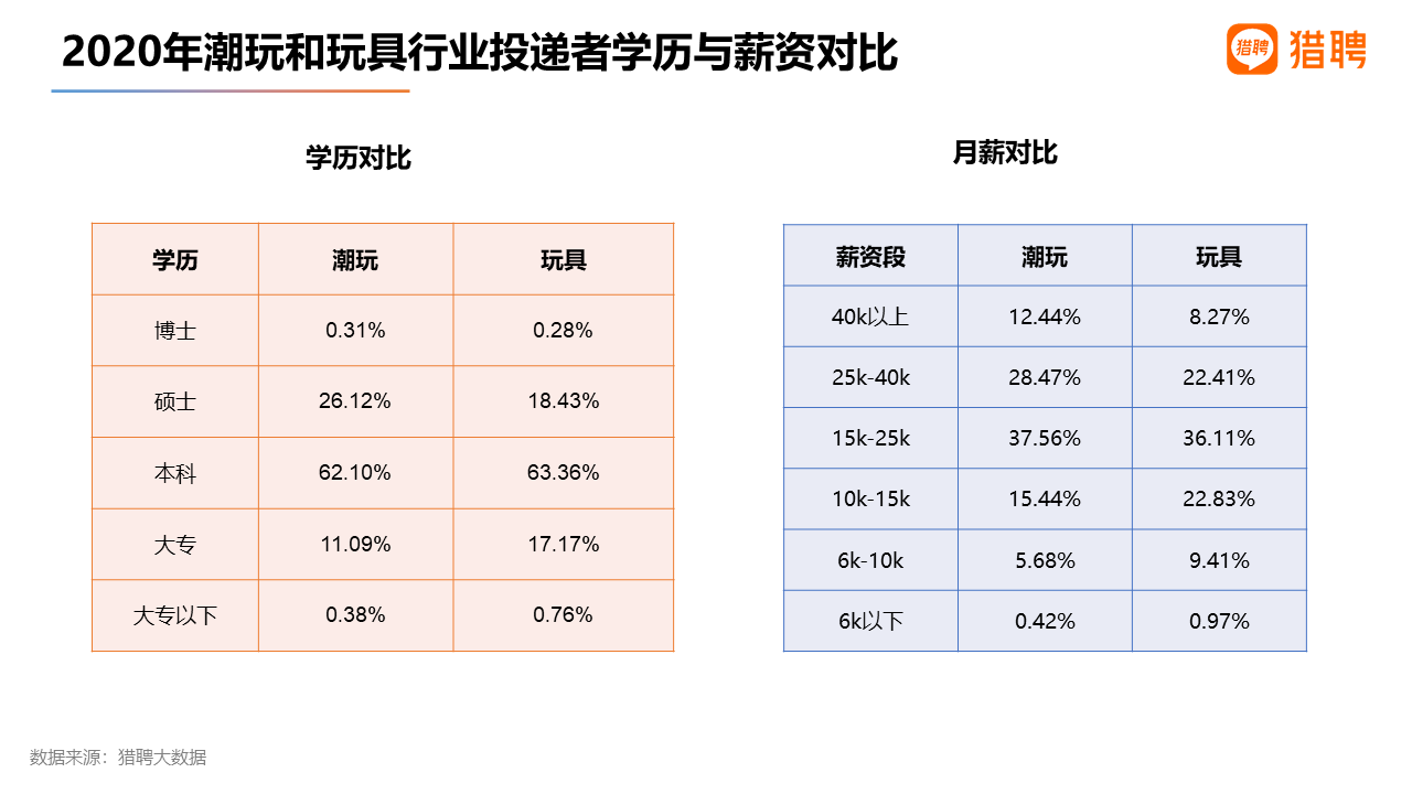 新興行業的發展離不開中高端人才的支撐,獵聘大數據顯示,潮玩行業簡歷投遞者的學歷分布具有明顯的高學歷化特征。其中,本科占比分別為62.10%;碩士以上學歷占比26.43%。玩具行業投遞者本科占比與潮玩相當,為63.36%,碩士以上學歷占比為18.71%。月薪為15k-40k的簡歷投遞者在潮玩行業占比為66.03%,在玩具行業占比為58.52%;月薪4萬元以上的投遞者在潮玩行業中占比12.44%,而在玩具行業中占比為8.27%。潮玩行業高薪投遞者占比明顯高于玩具行業。