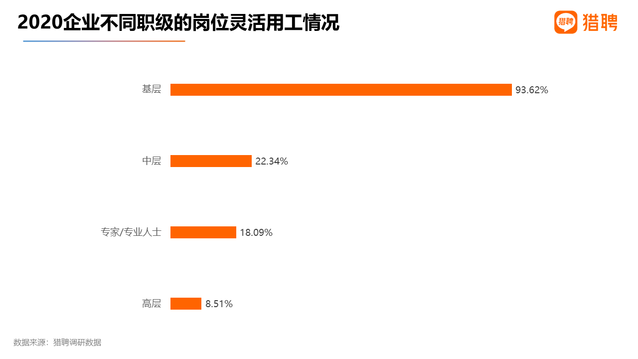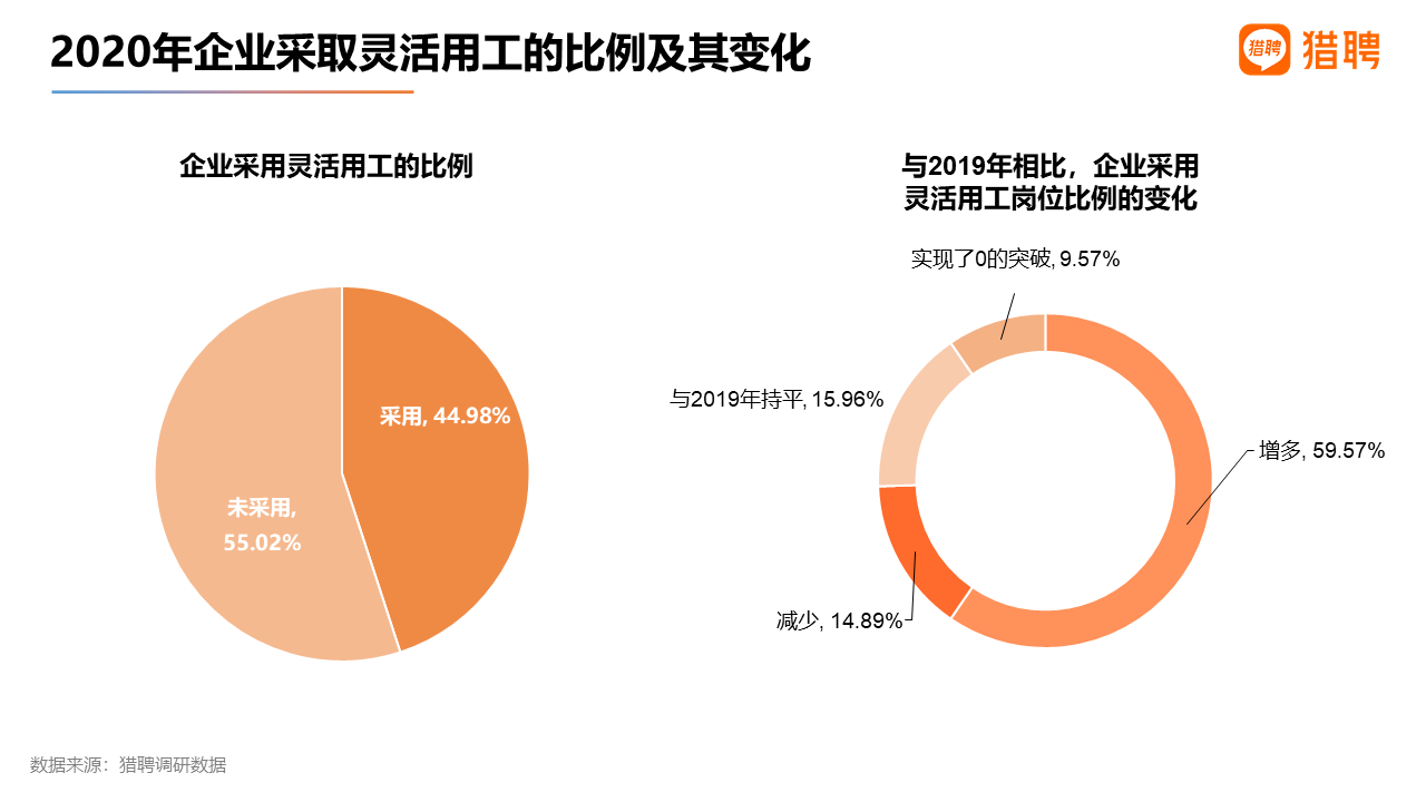 獵聘針對企業的調研數據顯示,2020年疫情下,44.98%的企業采用了靈活用工。與2019年相比,59.57%的企業表示采用靈活用工的崗位增多。近一年來,靈活用工成為就業市場的亮點之一,尤其在疫情期間為企業降本增效、為個人的多樣化就業提供了有利支撐。