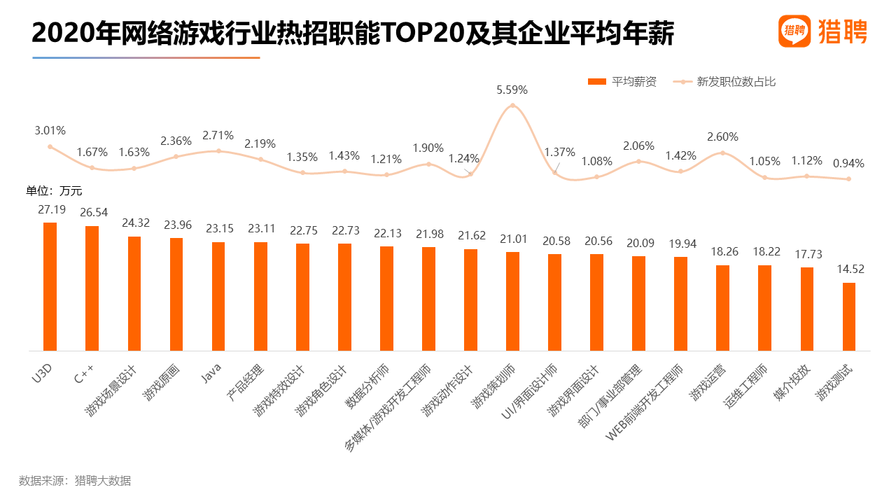 2020年很多行業都受到疫情的沖擊,網絡游戲行業卻實現了逆勢增長。獵聘大數據顯示,2020年網絡游戲行業企業新發職位同比2019年增長11.06%,新發職位平均年薪為20.89萬元,同比2019年的平均年薪18.07萬元,增長了15.61%,高于全行業整體招聘薪資漲幅。