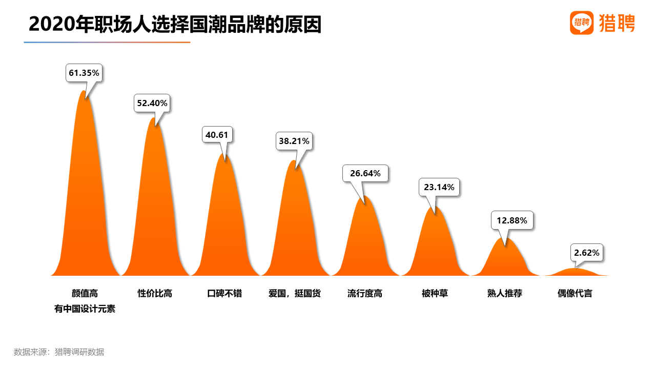 從獵聘本次調研來看,職場人使用國潮品牌最主要的三大原因是“有中國設計元素,顏值高”,得票率為61.35%;“性價比高”“口碑不錯”“愛國,挺國貨”排名第二至第四,得票率分別為52.40%、40.61%、38.21%。