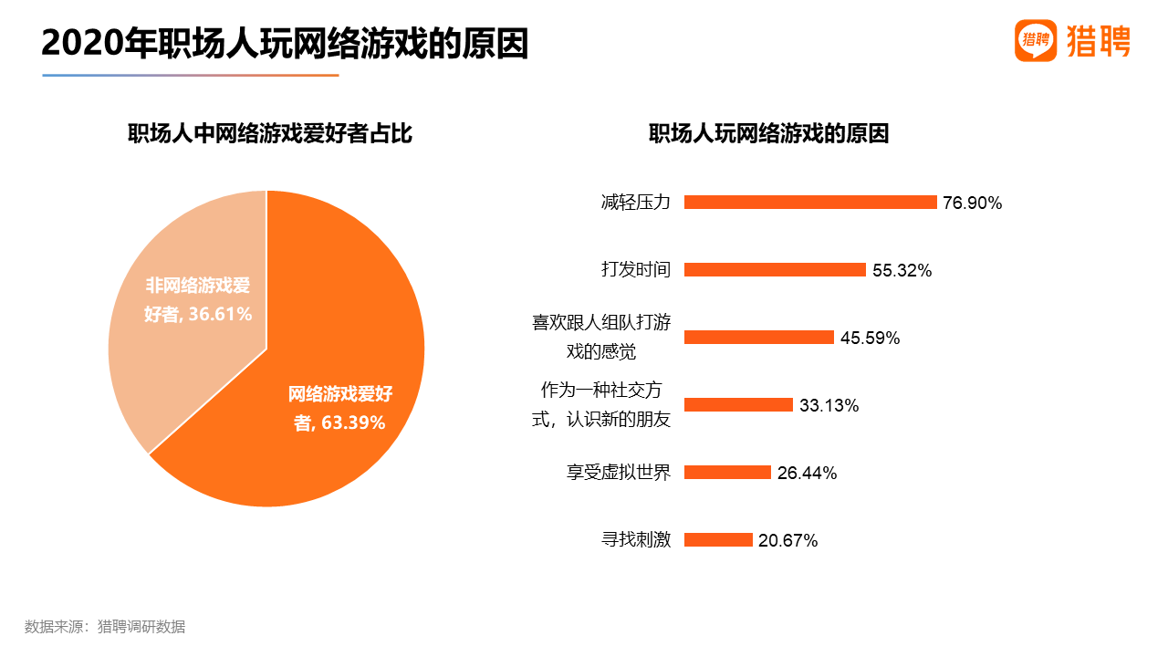 獵聘調研數據顯示,63.39%的職場人表示自己是網絡游戲愛好者。職場人喜歡網絡游戲排名前四的原因是,“減輕壓力”“打發時間”“喜歡跟人組隊打游戲的感覺”“作為一種社交方式,認識新的朋友”得票率分別為76.90%、55.32%、45.59%、33.13%。還有部分職場人表示喜歡游戲的原因是“享受虛擬世界”“尋找刺激”,得票率為26.44%、20.67%。