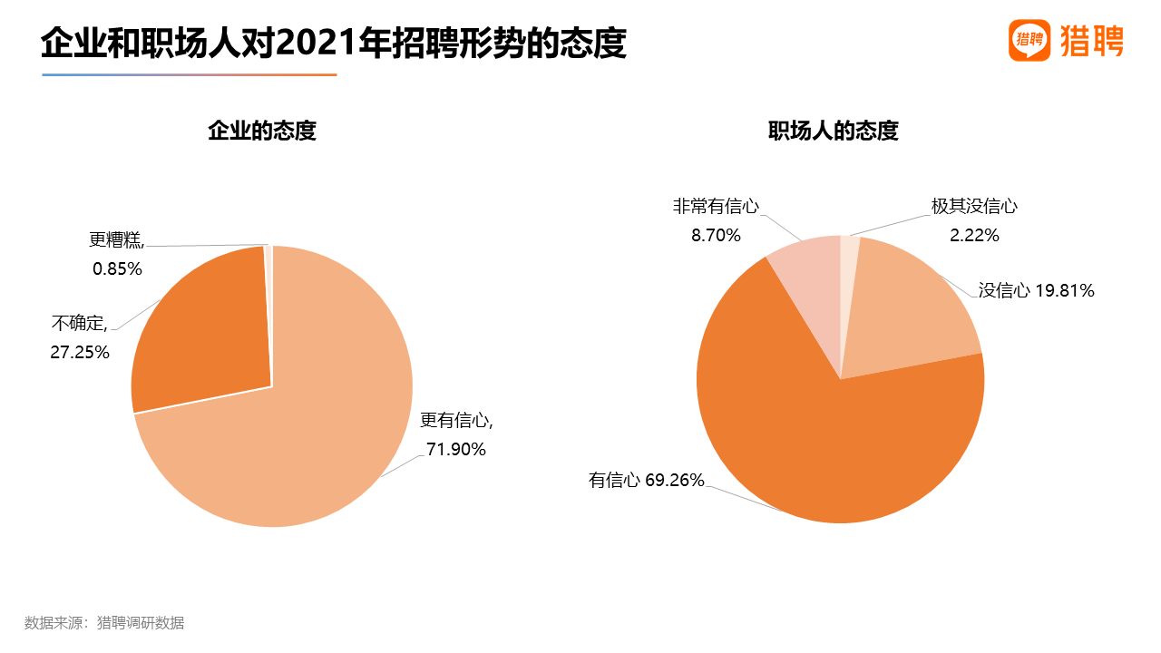 從獵聘調研顯示,71.90%的企業表示對2021年的招聘形勢更有信心;77.96%的職場人對當前就業形勢預期良好,其中69.26%的人表示有信心,8.70%的人表示非常有信心。