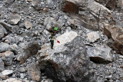 2015年8月14日,陜西山陽縣中村鎮碾溝村山體滑坡現場,武警安全員用旗語指揮。 CFP 資料