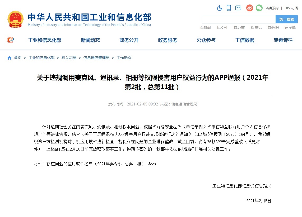 針對近期社會關(guān)注的麥克風(fēng)、通訊錄、相冊權(quán)限問題,依據(jù)《網(wǎng)絡(luò)安全法》《電信條例》《電信和互聯(lián)網(wǎng)用戶個人信息保護(hù)規(guī)定》等法律法規(guī),結(jié)合《關(guān)于開展縱深推進(jìn)APP侵害用戶權(quán)益專項整治行動的通知》(工信部信管函〔2020〕164號),我部組織第三方檢測機(jī)構(gòu)對手機(jī)應(yīng)用軟件進(jìn)行檢查,督促存在問題的企業(yè)進(jìn)行整改。截至目前,尚有26款A(yù)PP未完成整改(詳見附件),上述APP應(yīng)在2月10日前完成整改落實工作。逾期不整改的,我部將依法依規(guī)組織開展相關(guān)處置工作。