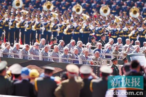 在武警國賓護衛隊的護衛下,一輛輛墨綠色的敞篷中巴車沿著綠蔭夾道的東長安街徐徐駛向天安門。車廂里,300多名平均年齡90歲的抗戰老戰士、抗日英烈子女和抗戰支前模范代表,有的拿著小紅旗,有的握著鮮花,微笑著來回揮動。這是國共兩黨抗戰老兵首次一起接受檢閱。秋風輕拂著他們滿頭的白發,秋陽輝映著他們胸前的勛章。那一刻,天安門廣場上的掌聲,潮水般洶涌……