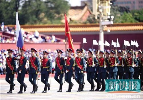 伴隨著激昂的檢閱進行曲,來自亞洲、歐洲、非洲、大洋洲和美洲等世界五大洲的17個外軍方隊和代表隊近千名官兵,高擎旗幟,莊重而行……這是中國首次邀請外國軍隊代表參加閱兵分列式。藍的像海,白的如雪,紅的似火——這些身穿富有本國特色軍裝,膚色各異、語言不同、人數或多或少的外軍官兵,踏著和中國軍隊同樣的節拍,為銘記歷史而來,為守衛和平而閱。