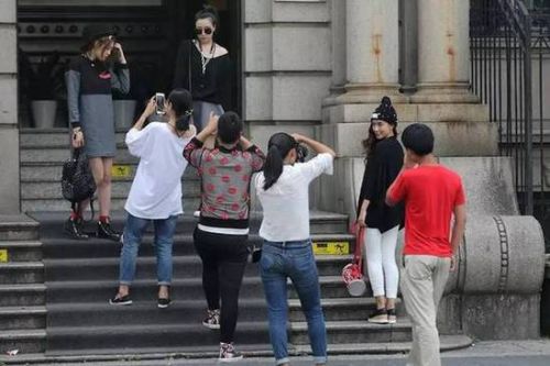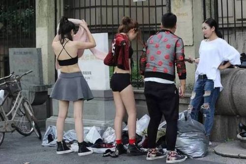 圖為“淘女郎”們很專業(yè)地?cái)[著各種pose,一兩分鐘就拍完了一套。工作人員遞來另一套服裝,模特們竟然當(dāng)眾直接脫掉了上衣和褲子、裙子,只剩下內(nèi)衣內(nèi)褲,站在路邊,然后又淡定地套上另一件,繼續(xù)拍攝。